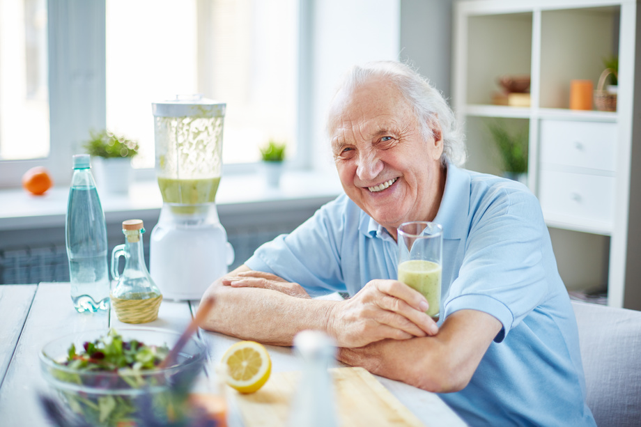 Senior man with glass of fruit smoothie sitting in the kitchen