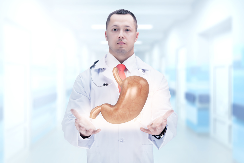 Doctor with stethoscope and stomach on the hands in a hospital. High resolution.